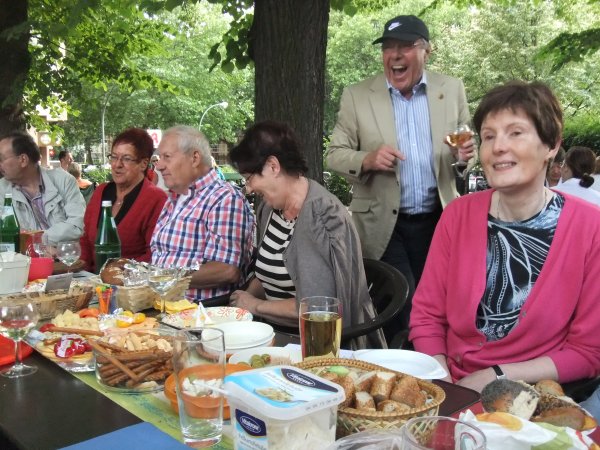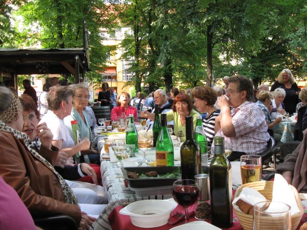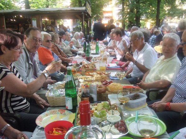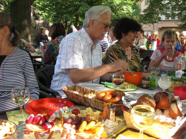 Archiv des Partnerschaftsverein Charlottenburg 10. Juli 2013 - Treffen am WeinbrunnenWie üblich, fand der Juli-Stammtisch am Weinbrunnen auf dem Rüdesheimer Platz statt. Rund 30 Mitglieder und Freunde des Verein fanden sich ein und jeder hatte eine Kleinigkeit zum Essen mitgebracht. So waren die Tische reichlich gefüllt, wie man auf den nachfolgenden Bildern sehen kann: