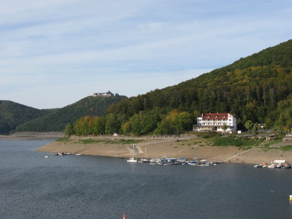 Blick von der Sperrmauer Richtung Hotel und Burg