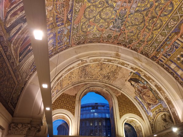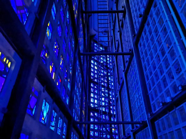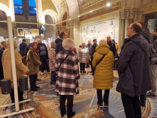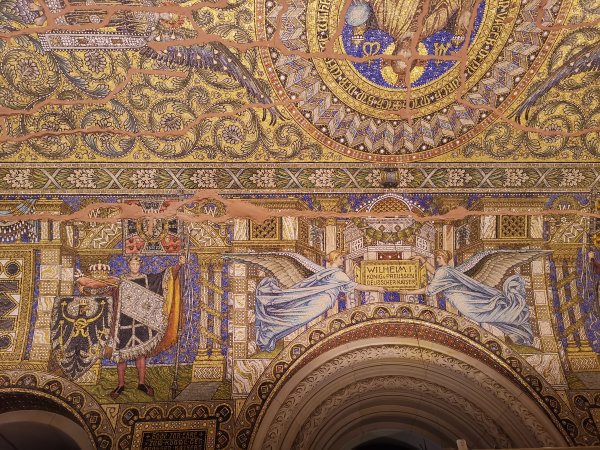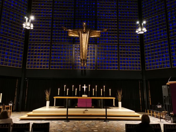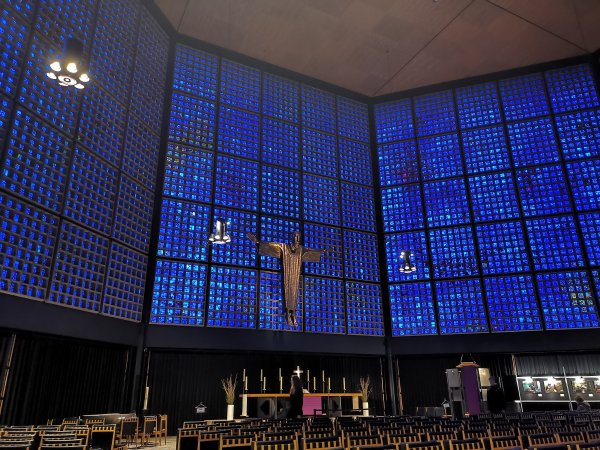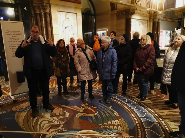 Archiv des Partnerschaftsverein Charlottenburg 02. März 2023 - Führung durch die Kaiser-Wilhelm-GedächtniskircheDiesmal stand eine Besichtigung und Führung durch die Kaiser-Wilhelm-Gedächtnis-Kirche auf dem Programm. Der ehemalige Pfarrer der Gedächtniskirche, Herr Martin Germer, hatte sich bereiterklärt, uns bei diesem Termin zu begleiten und vermittelte uns interessante Einblicke in die Entstehung sowohl des Neubaus nach dem Krieg, als auch den alten Kirchenbau, von dem jetzt nur die Eingangshalle und die Turmruine erhalten sind. Besonders erwähnenswert sind die blauen Fenstergläser, mit denen im neuen Kirchenraum ein ganz besonderes Licht erzeugt wird. Kaum bekannt ist, dass der achteckige Bau aus zwei Wänden besteht und so konnten wir auch den Zwischenraum zwischen der äußeren und inneren Wand besichtigen. Nachfolgend ein paar Fotos von der Führung: